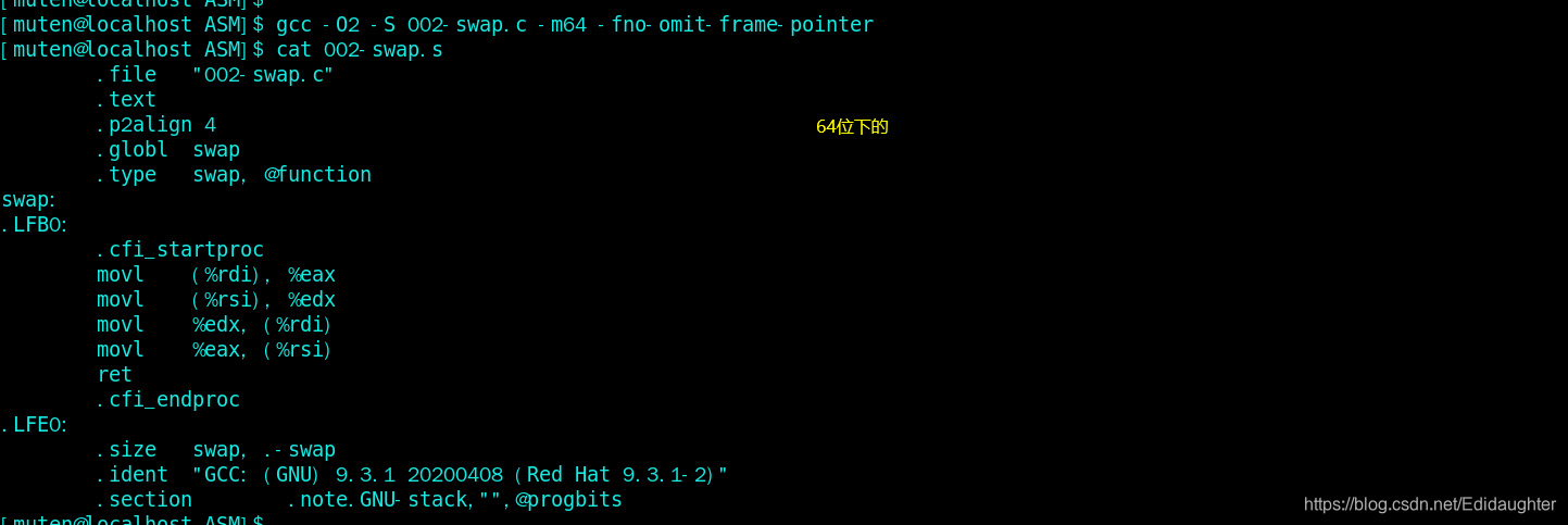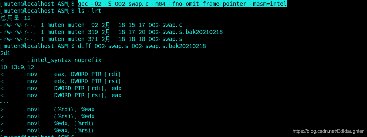 gcc -O2 -S 002-swap.c -m64 -fno-omit-frame-pointer -masm=intel