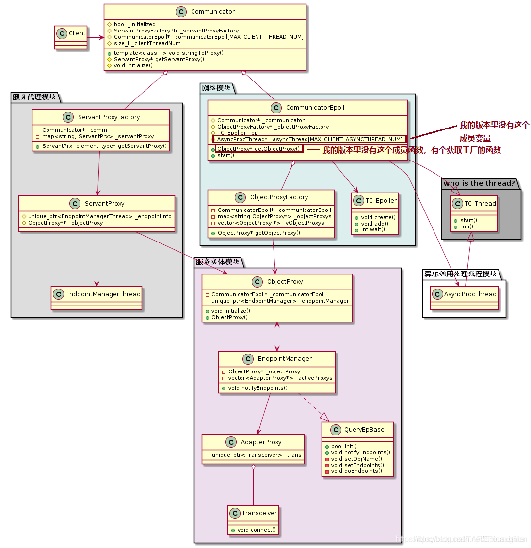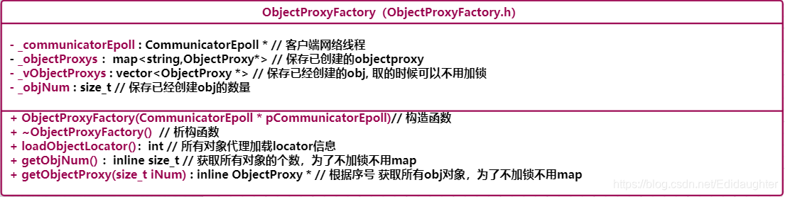 类聚合了两个比较重要的类,一个是CommunicatorEpoll,负责网络线程的建立与通过ObjectProxyFactory生