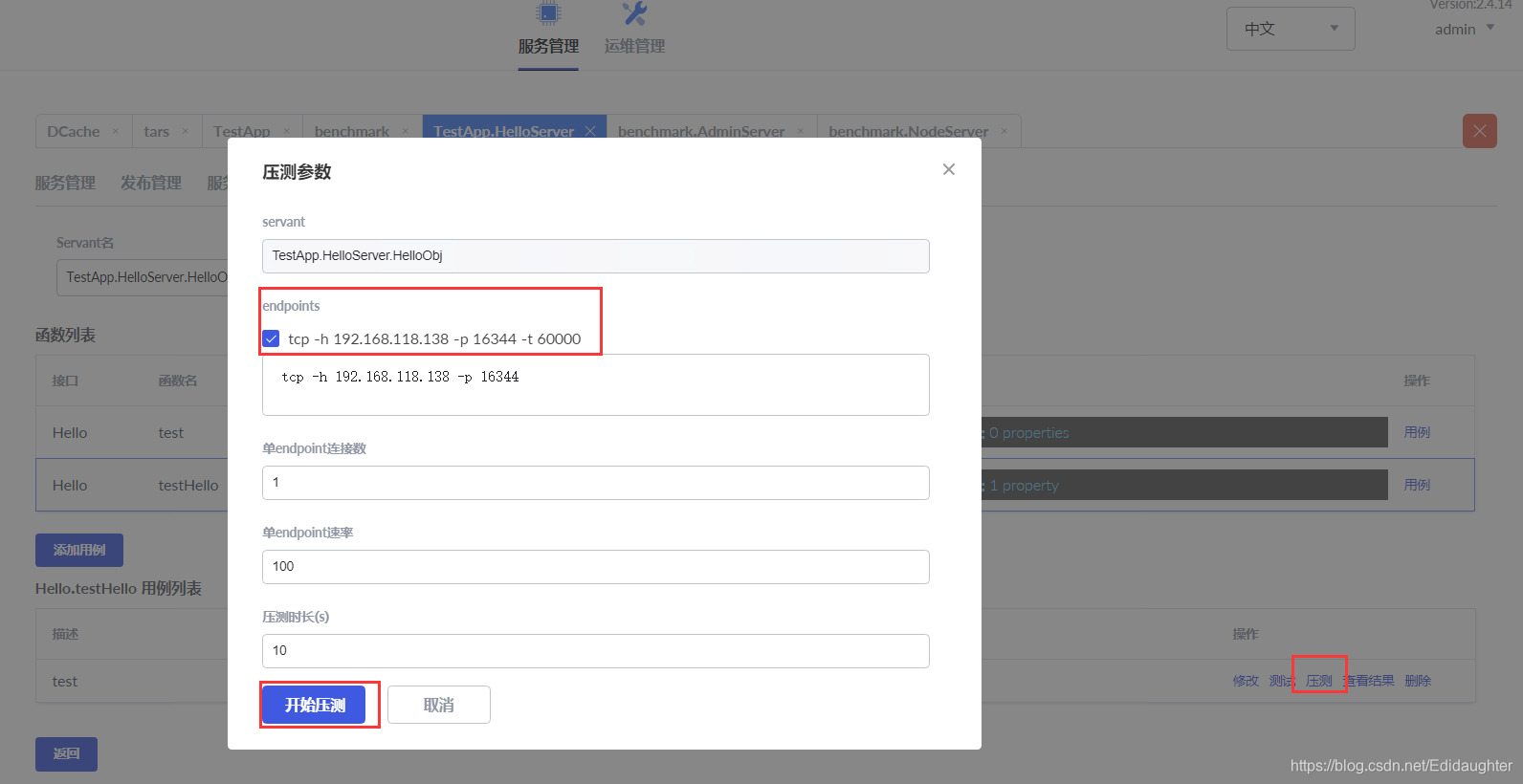 4.3 点击【压测】,勾选【endpoint】,点击【开始压测】