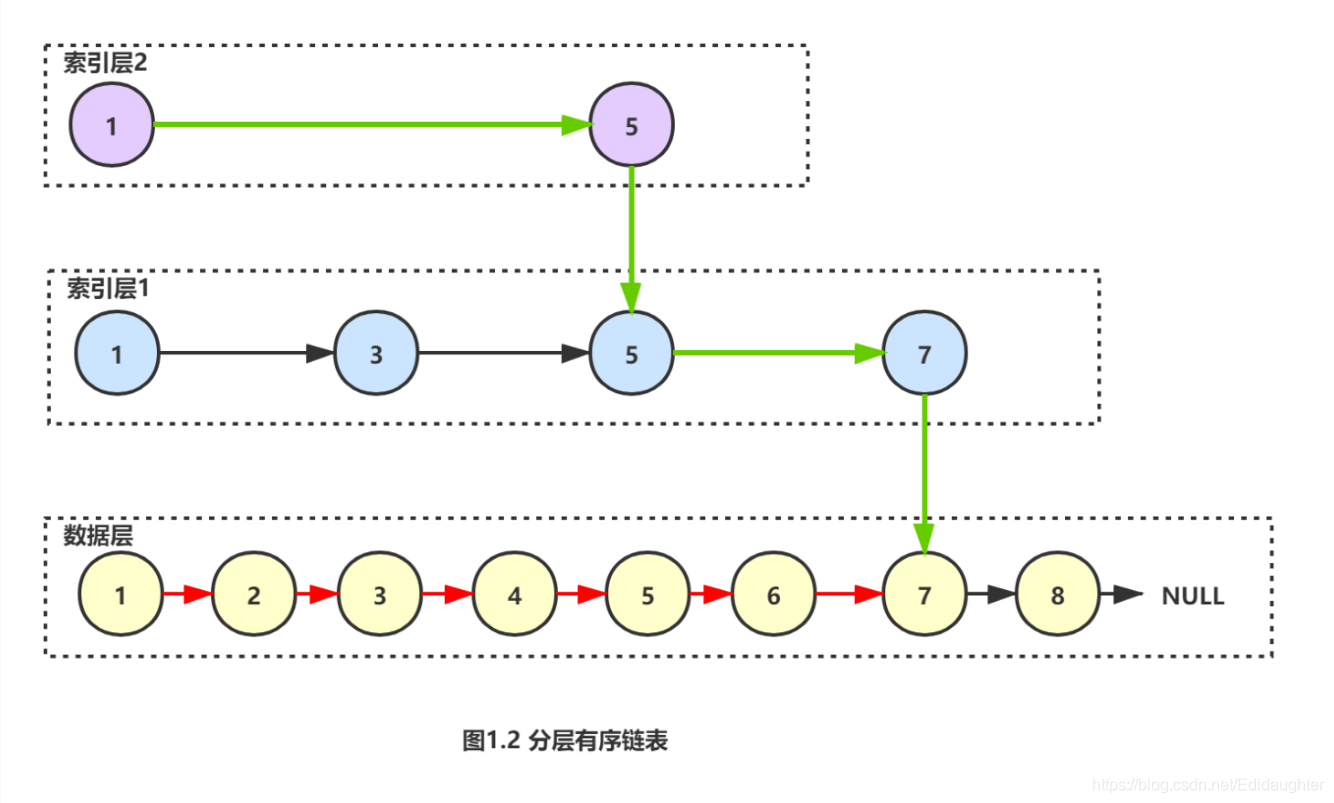 通过将有序集合的部分节点分层,由最上层开始依次向后查找,如果本层的next节点大于要查找的值或next节点