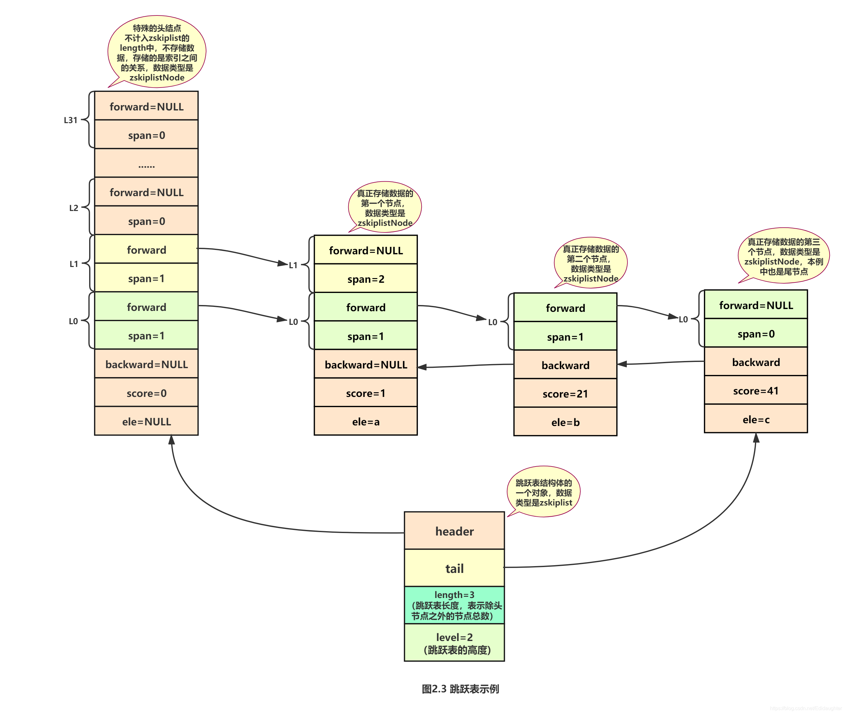 (3)除头节点外,层数最多的节点的层高为跳跃表的高度level,图2.3中跳跃表的高度为2;