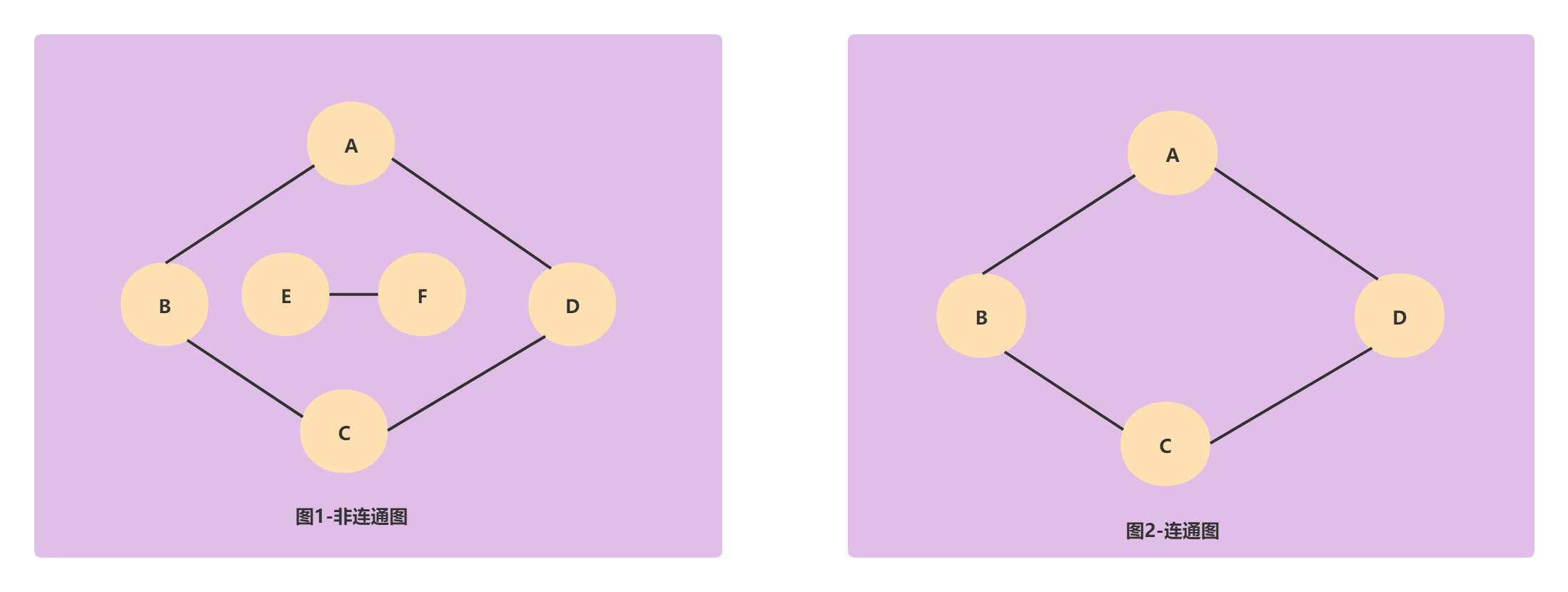 在无向图G=(V,E)中,如果从顶点v到顶点w有路径,则称v和w是相通的,如果图G中的任意两个顶点Vi和Vj属于E,则两个顶点是联通的,则称G是连通图。如下图1,它的顶点A和顶点B,C,D都是相通的,但是显然顶点A与顶点E或者F就没有路径,因此不能算是连通图。而图2中,顶点A,B,C和D互相都是连通的,所以本身是连通图。