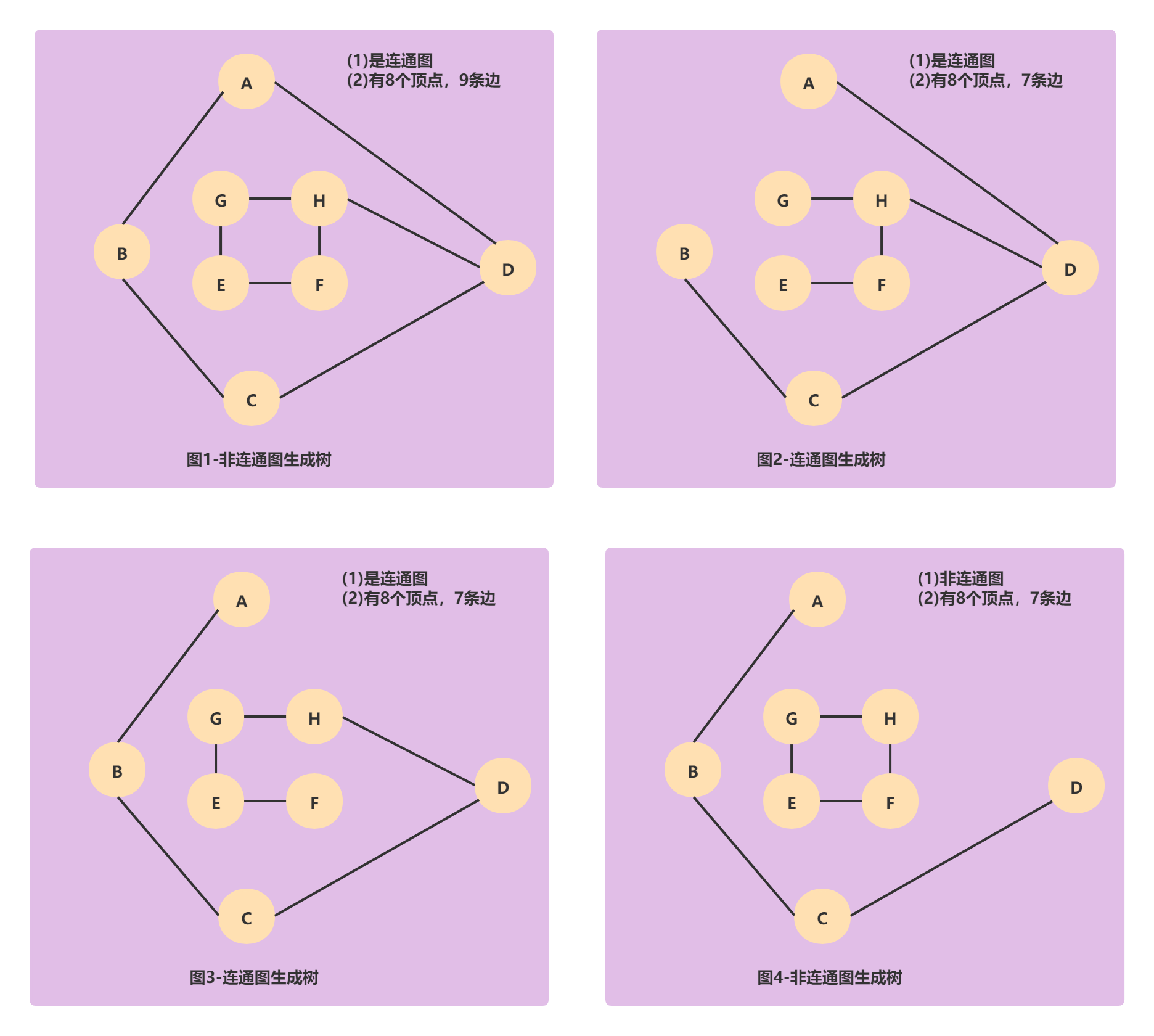 图一是一个普通图,但是它显然不是生成树,当去掉两条构成环的边之后,比如图2或者图3,就满足n个顶点n-1条边且连通的定义了,因此图2和图3都是联通图的生成树。从这里也知道,如果一个图有n个顶点和小于n-1条边,则是非连通图;如果它多于n-1条边,必定构成一个环,因为这条边是得它依附的那两个顶点之间有了第二条路径,比如图2和图3,随便加哪两个顶点的边都会构成环,不过n-1条边并不一定是生成树,比如图4。