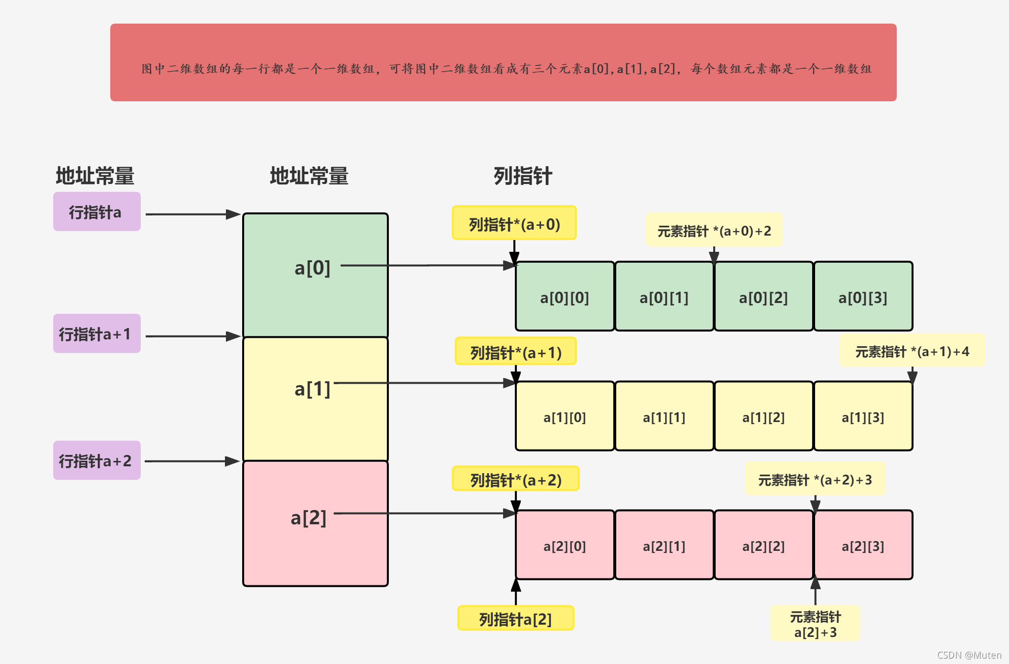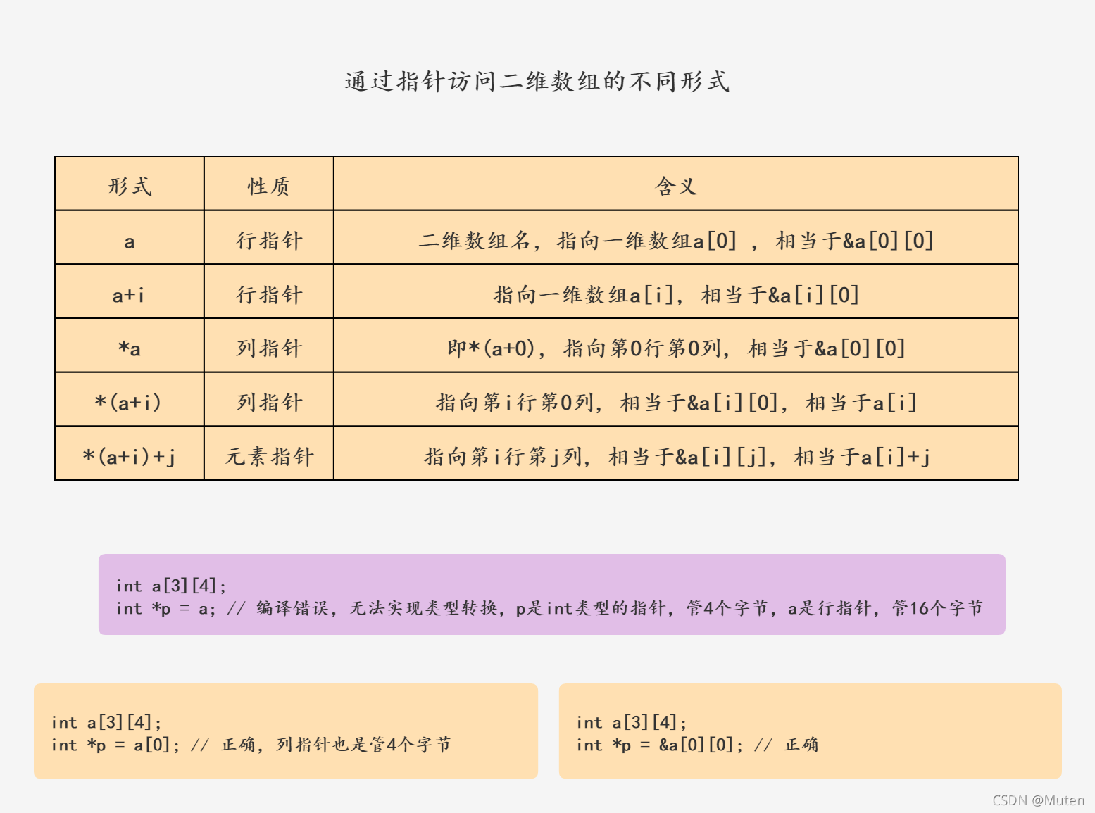 (1)元素指针: *(a+i)+j, 等价于a[i]+j, 等价于&(a[i][j]), 表示元素a[i][j]的地址