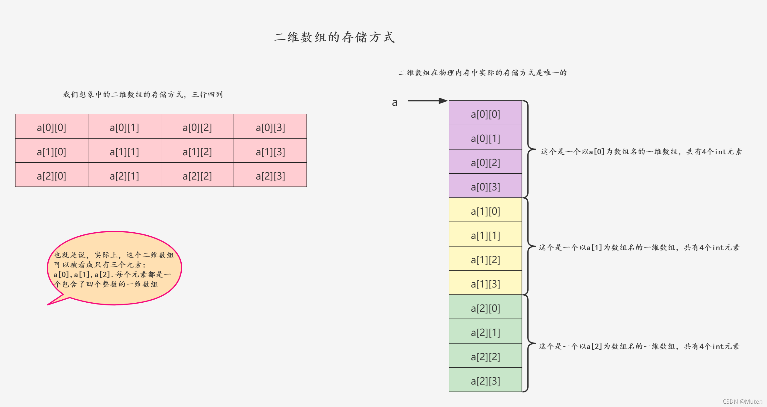 如何理解二维数组?我们以二维的方式理解二维数组,它在存储的时候却是唯一的。