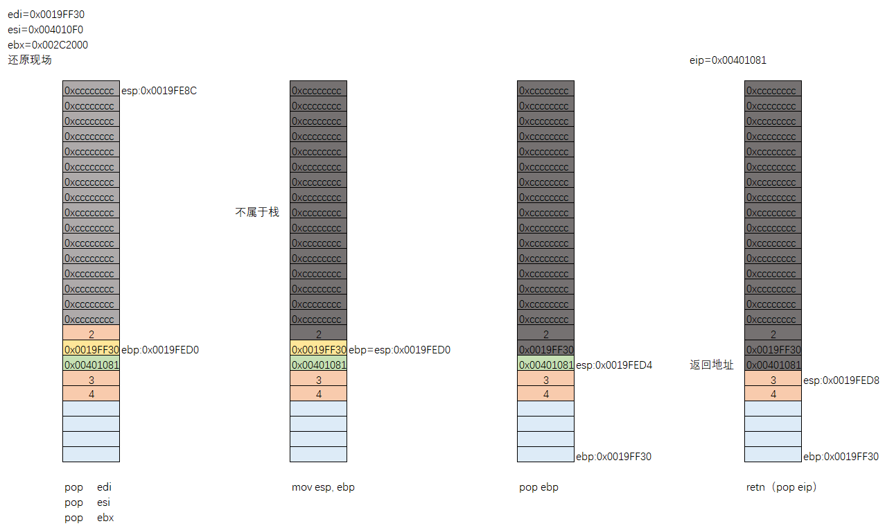 - 用来恢复现场,把最开始函数没执行时存在堆栈临时储存起来的一些数值的值或者地址还原回去