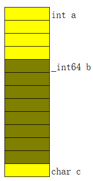 __int64 b的内存,__int64宽度为8字节,结构体字节对齐数为8,相等则取8作为此成员的字节对齐数。但是由于__int64 b的起始地址要为8的整数倍,所以只能空出来4字节内存,从offset8开始存储,分配8字节内存 -