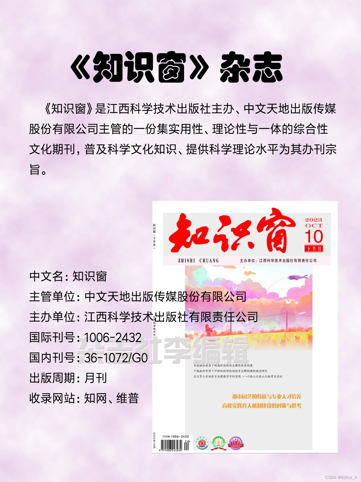 《知识窗》是一本由江西科学技术出版社和中文天地出版传媒主办的月刊,专注于科学文化的普及与理论提升,被知网和维普等收录。