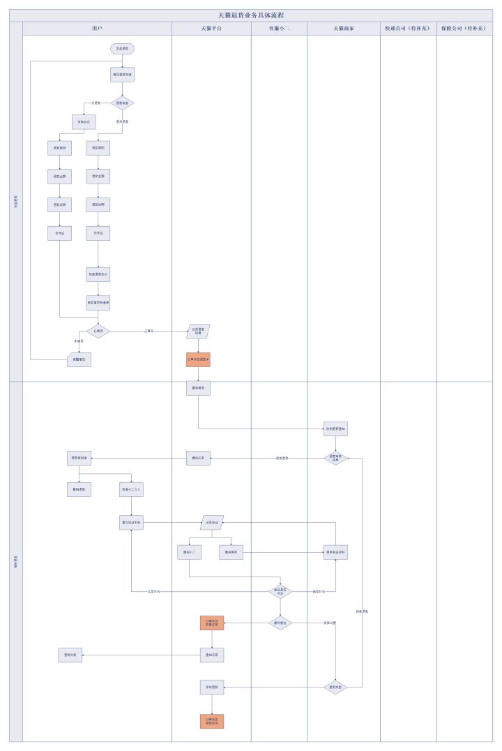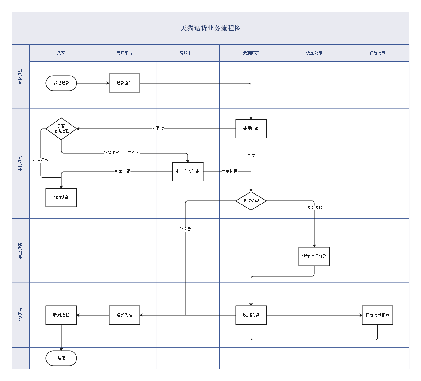 怎么理解这两句话呢?我们来“看图说话”(一张是天猫退货业务流程图,一张是天猫退货用户侧、平台侧、商家侧的功能流程图)