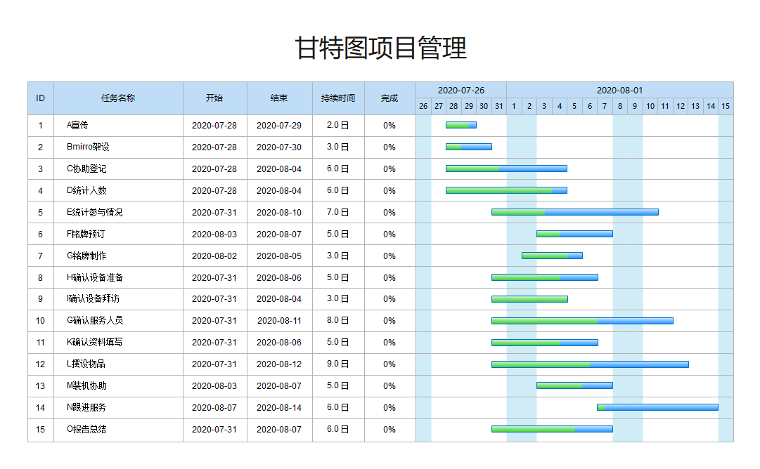 甘特图,简单来说,就是下面这种用条状图来显示任务进度的图形图表。其本质是一种项目计划。