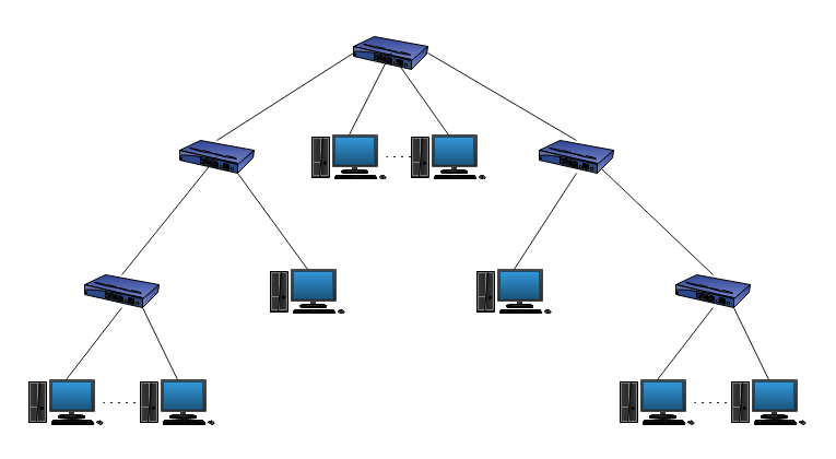 在实际建造一个大型网络时,往往是采用多级星形网络,将多级星形网络按层次方式排列即形成树形网络。