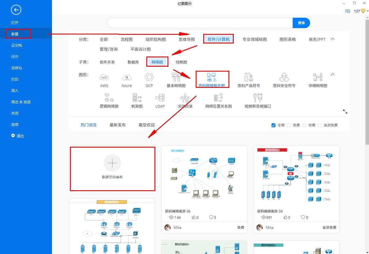 第一,打开软件,选择“新建>软件/计算机>网络图>思科网络拓扑图>新建空白画布”;