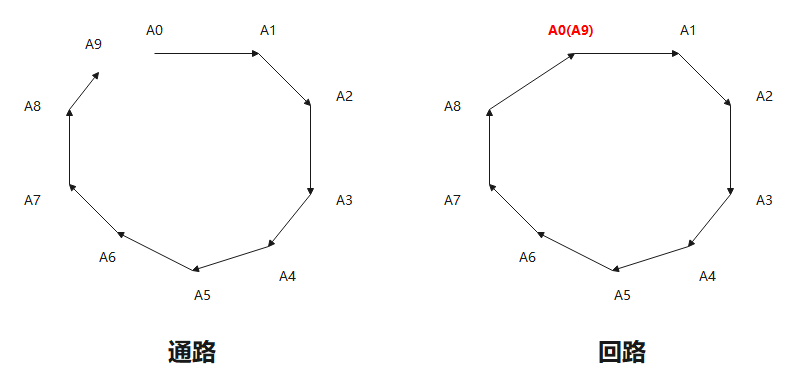 左侧是通路,右侧是回路,区别就是回路的起点和终点是重合的。