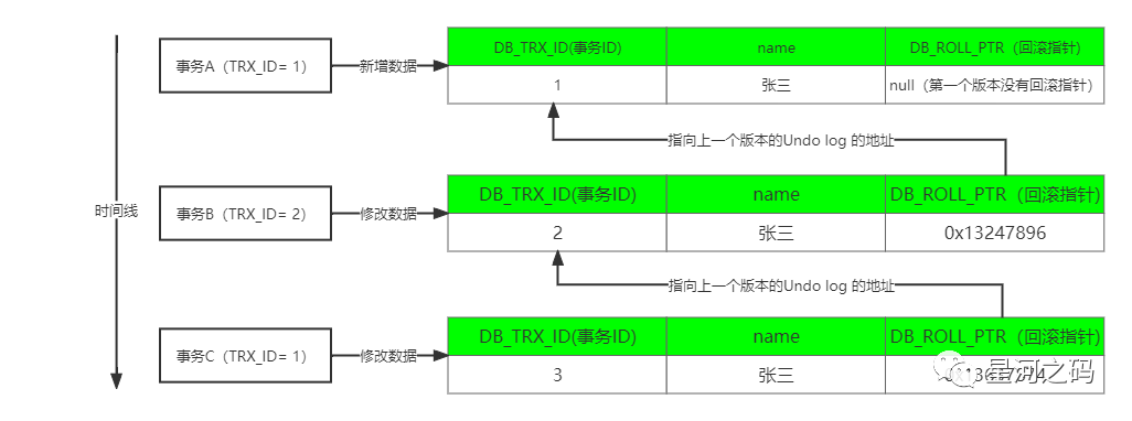 表示在当前事务【creator_trx_id】开启以后,有新的事务开启,并且新的事务修改了这行数据的值并提交了事务,因为这是【creator_trx_id】后面的事务修改提交的数据,所以当前事务【creator_trx_id】是不能读取到的。