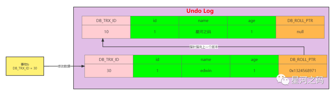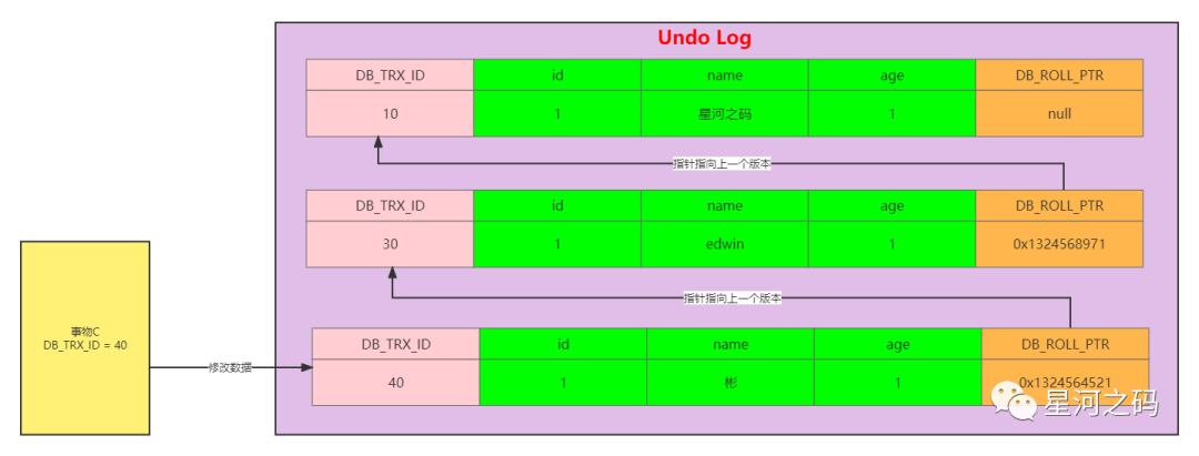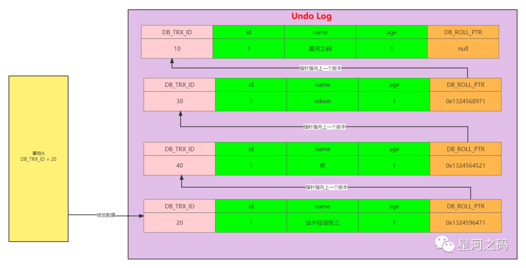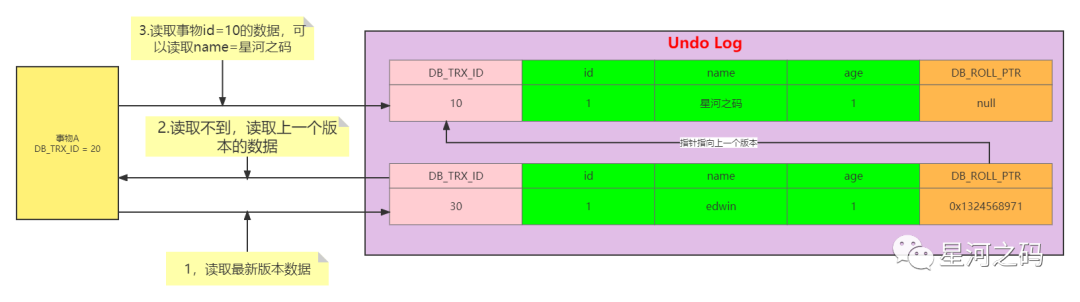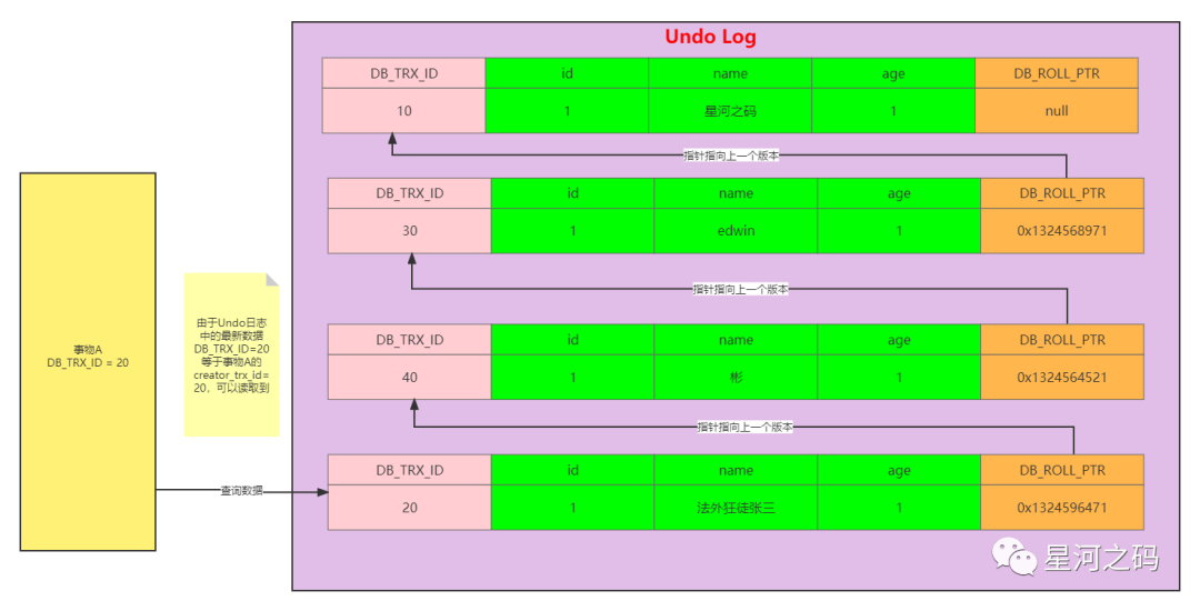 此时由于事物A,由于事物A的m_up_limit_id=31,而日志中的DB_TRX_ID=40,根据可见性判断规则可以知到,事物A不能读取到DB_TRX_ID=40的记录,按照版本链的DB_POLL_PTR继续往上找,找到DB_TRX_ID=30的记录,虽然30在事物A的的m_ids=[20,30],但是DB_TRX_ID=30不等于事物A的creator_trx_id=20,所以还是不能读取,继续往上找,最终读取到了DB_TRX_ID=10的记录,name=星河之码
