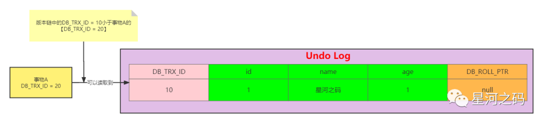 日志事务Id【DB_TRX_ID = 10】 < 最小活跃事务ID【m_low_limit_id=20】,因此可以读取到DB_TRX_ID = 10这条版本链中的数据。即name = 星河之码。