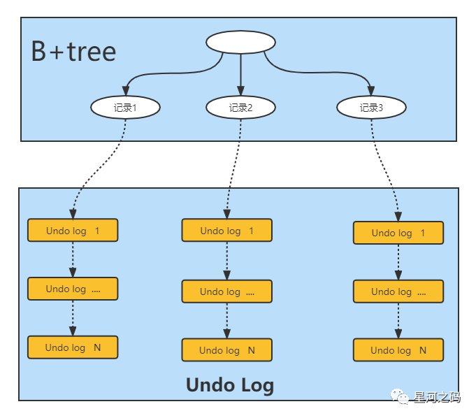 此时需要沿着 undo log 的版本链向前找,接着会找到该行数据的上一个版本db_trx_id=10,由于db_trx_id=10小于 m_low_limit_id的值,因此事务 A 能读取到该版本的值,即事务 A 读取到的值是星之码。