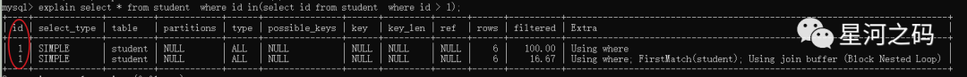 优化器对子查询做了半连接(semi-jion)优化时,两个查询的 id 是一样的explain select * from student where id in(select id from student where id > 1);
