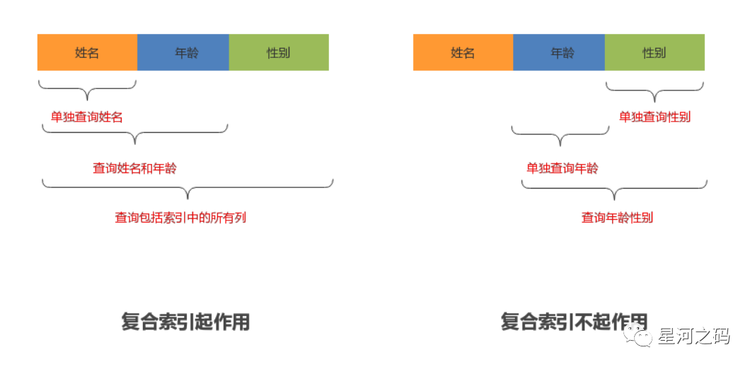组合索引使用时遵循最左前缀原则,最左前缀顾名思义,就是最左优先,即查询中使用到最左边的列, 那么查询就会使用到索引,如果从索引的第二列开始查找,索引将失效。