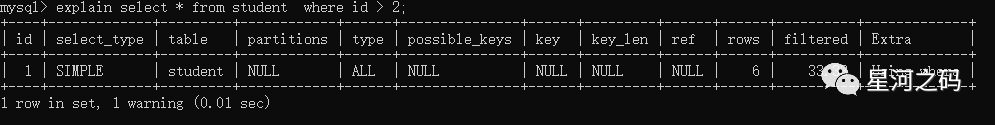 - 如果查询优化器决定使用全表扫描的方式对某个表执行查询时,rows 列就代表预计需要扫描的行数;