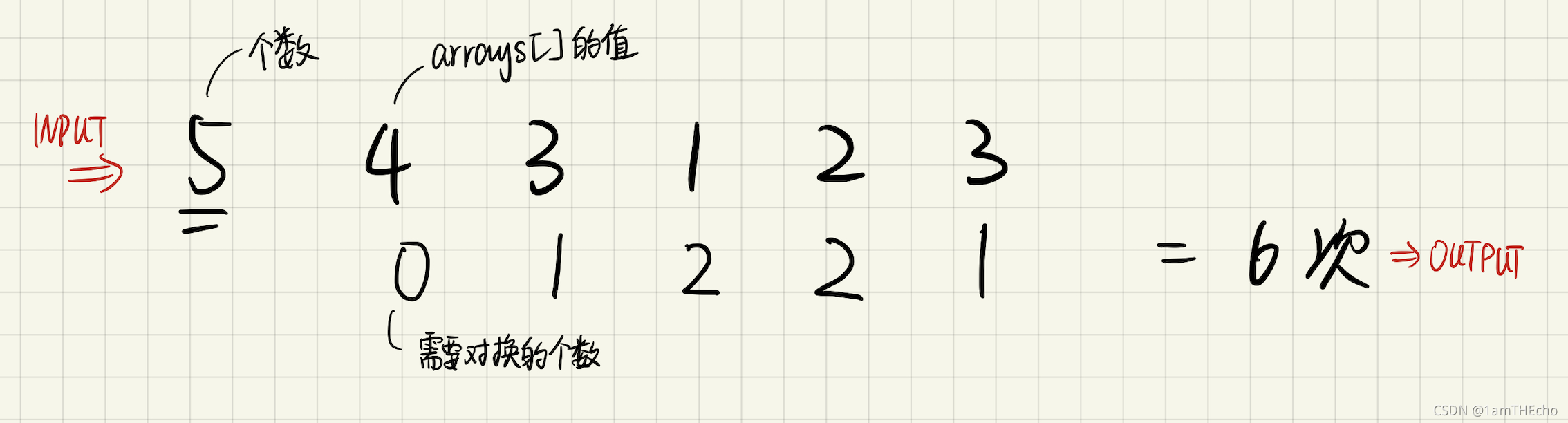 本题可以理解成,给定无序数组,求解经过最少多少次的相邻元素的交换,可以使数组从小到大有序。注意不要被不要被“QuickSort”这个词迷惑,该题使用的方法跟快排无关,而是归并排序的变形。如下图所示,输入的一组测试用例中,5为当前测试用例里的数组元素个数,43123为给定的无序数组,排序后应为12334,每个数到正确顺序的位置需要对换的次数为01221,因此结果输出为6。