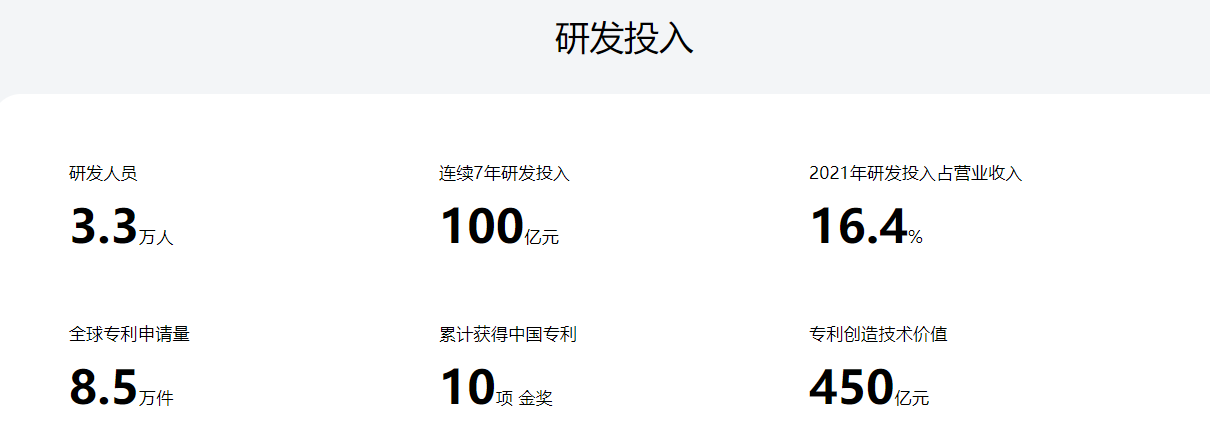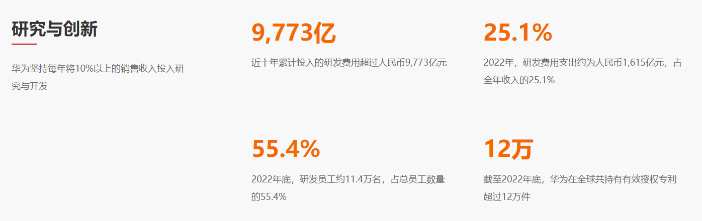 根据报告,华为以190亿欧元(约合人民币1370亿元)的研发金额位列第四,领先苹果、三星等一众知名企业。而在2012年,华为在这项研发排行榜上的名次是第43名。10年来排名晋升到第四名,可见华为在核心科技方面的投入力度之大。根据华为官网最新资料显示,2022年底,华为研发人员约11.4万名,占总员工数量的55.4%。研发经费支出约为1615亿人民币,占全年收入的25.1%。