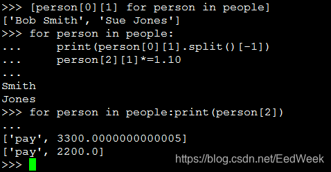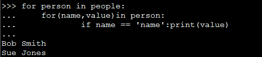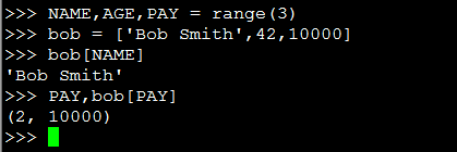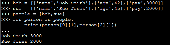 >>> bob = [['name','Bob Smith'],['age',42],['pay',3000]]
