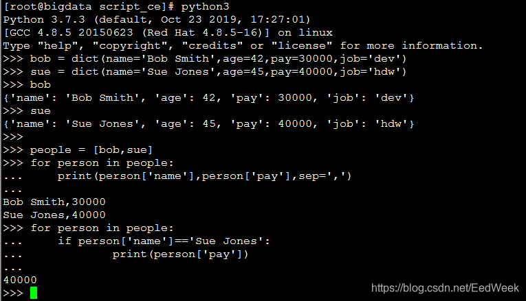 >>> bob = dict(name='Bob Smith',age=42,pay=30000,job='dev')