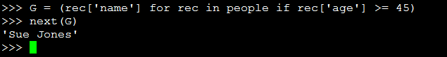 >>> G = (rec['name'] for rec in people if rec['age'] >= 45)