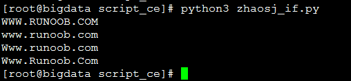 #!/usr/bin/python # -*- coding: utf-8 -*- #Author: zhaosj str = "www.runoob.com" print(str.upper()) # 把所有字符中的小写字母转换成大写字母 print(str.lower()) # 把所有字符中的大写字母转换成小写字母 print(str.capitalize()) # 把第一个字母转化为大写字母,其余小写 print(str.title()) # 把每个单词的第一个字母转化为大写,其余小写