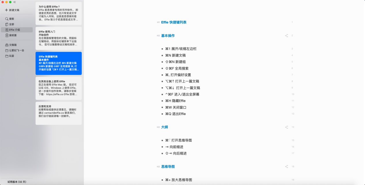 Effie 的思维导图和文章是结合在一起的,所以永远不用担心写到一半去另一台设备或者另外一款软件上找思维导图参看的尴尬。