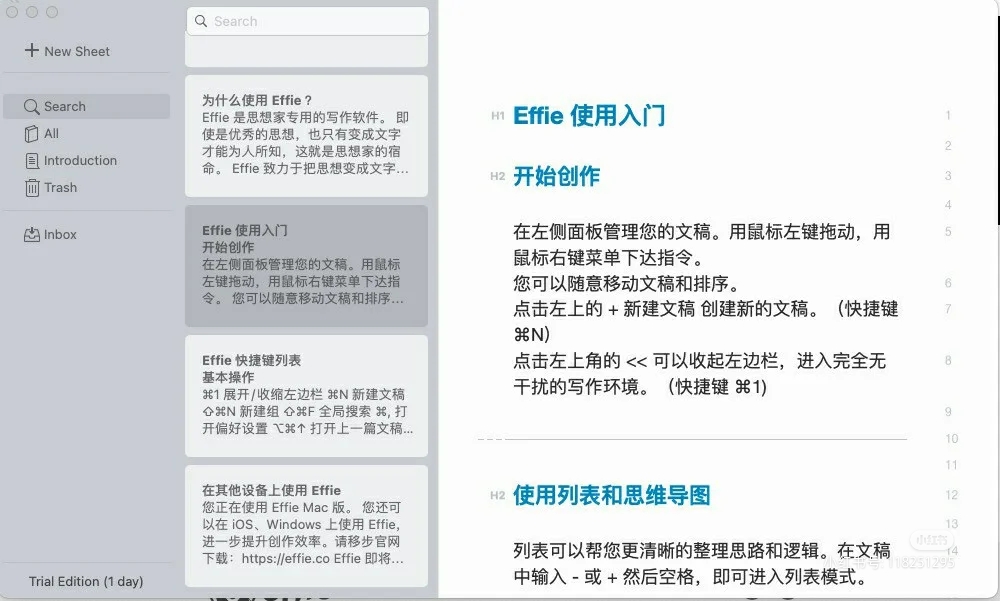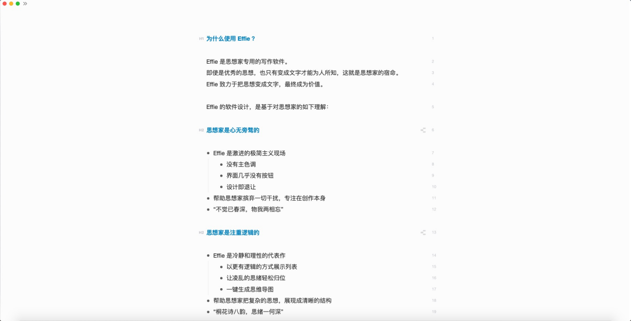 Effie 在设计上一直追求简约,为的就是方便用户在写作时更好地投入和专注。