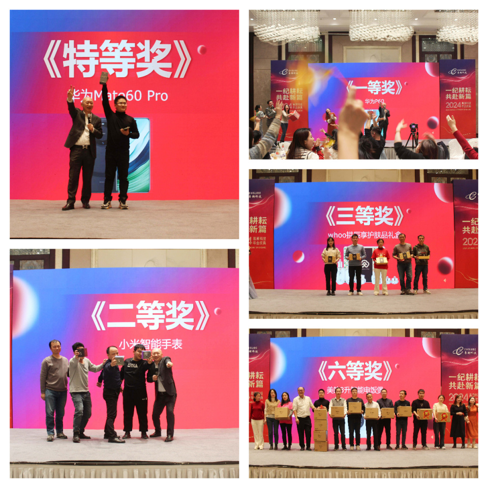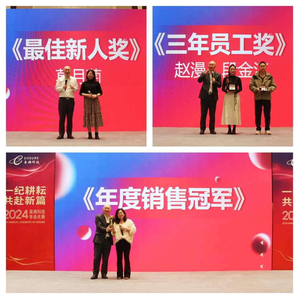 年会现场,颁发了年度最佳新人奖、三年员工奖、销售冠军奖等奖项。辛勤耕耘,寻梦前行,他们实至名归!