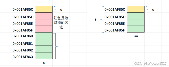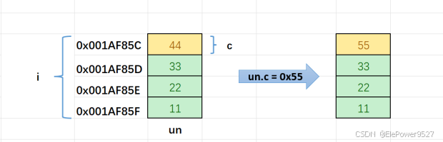 代码1输出的三个地址⼀模⼀样,代码2的输出,我们发现将i的第4个字节的内容修改为55了。我们仔细分析就可以画出,un的内存布局图。