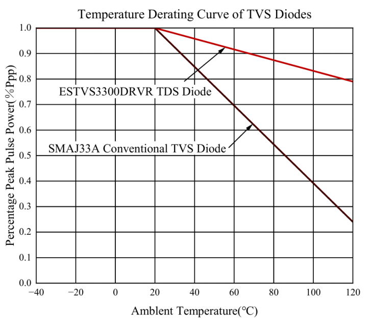 传统TVS二极管虽被设计成可以在广泛的温度范围内工作,但高温环境下仍需要考虑浪涌事件期间是否会超过TVS二极管的最大额定功率,避免器件产生热损坏。并且由于TVS自身耗散功耗大于TDS,其泄放电流时会增加自身温度,从而导致额定功率下降。图1显示了ESTVS3300DRVR和SMAJ33A在环境温度范围内8/20μs PPP的降额曲线,传统TVS二极管额定耗散功率随着环境温度的升高而急剧降低,其对温度变化非常敏感,这对于后端系统防护存在重大安全隐患。在TDS系列中,钳位电压的闭环调节可以保证器件在不同温度下的额定功率的稳定性。这意味着与传统TVS二极管相比,温度的降额非常小,从而有效保证整体系统的可靠性。