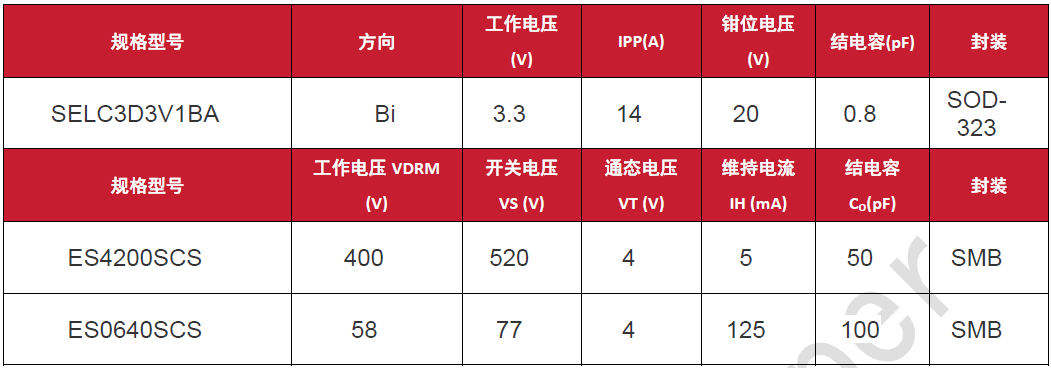 我们为100M以太网提供了两种不同的防护器件,专为保护该接口的高速差分线路而设计,型号分别为SELC3D3V1BA和ES4200SCS。SELC3D3V1BA为一款超低电容瞬态电压抑制器阵列,其工作电压为 3.3V,符合IEC61000-4-2 4级ESD防护规范和IEC 61000-4-5 3级雷击浪涌防护规范,在 ±15kV空气放电、 ±15kV接触放电和2kV浪涌电压下提供瞬变保护。ES4200SCS是一款半导体放电管TSS,该器件的工作电压为400V,通常用于帮助保护敏感的电信设备,如通信线路信号线路和数据传输线路免受由雷电和设备切换操作引起的瞬变浪涌电压的损坏。