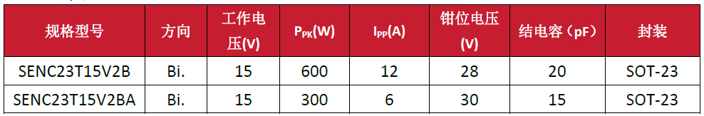 SENC23T15V2B 和 SENC23T15V2BA是用于防止静电放电、低等级过压等瞬态事件ESD防护器件,工作电压15V,最大峰值电流12A,器件均能满足IEC 61000-4-2 Level 4(±30kV空气放电、±30kV接触放电)静电防护标准及IEC 61000-4-5雷击浪涌防护需求。