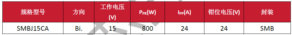 SMBJ15CA是用于防止高等级浪涌事件、雷击事件等瞬态事件TVS防护器件,工作电压15V,钳位电压24V以及最大峰值电流24A,该器件能满足IEC 61000-4-5雷击浪涌防护需求。
