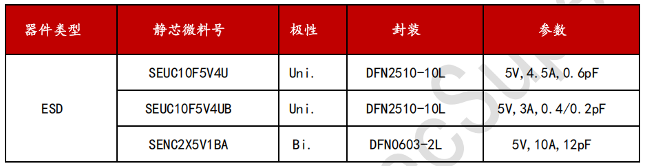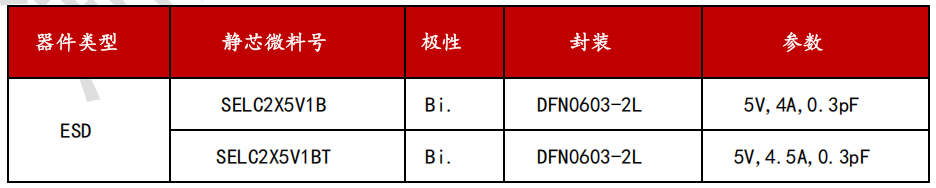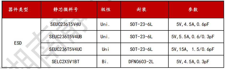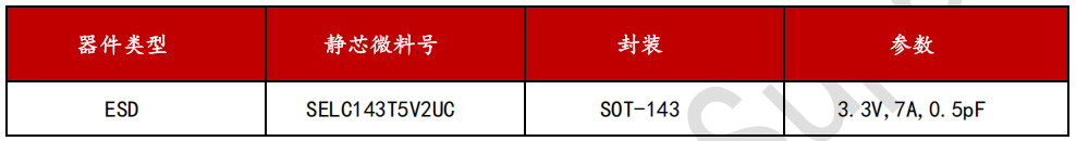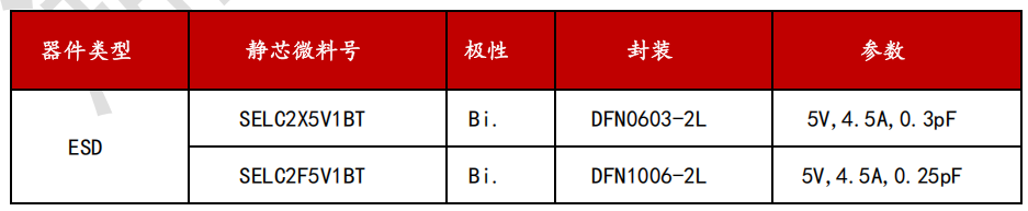D+/D-两个引脚是用于兼容USB 2.0接口,D+和D-引脚承载速率为480Mbps的差分数据信号,这对差分线上的电压在正常工作条件下可以达到 5V。推荐采用湖南静芯旗下ESD回扫型器件SEUCS2X3V1B,该器件的工作电压为 3.3 V,钳位电压为仅5.5V,结电容仅为0.14pF,封装为DFN0603-2L,符合IEC 61000-4-2 (ESD) 规范,在 ±15kV(空气)和 ±15kV(接触)下提供瞬变保护。