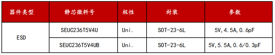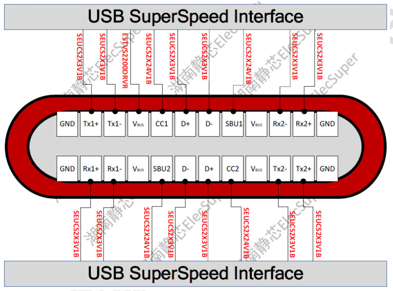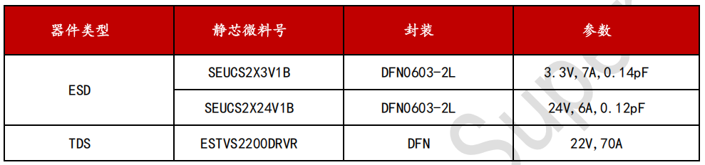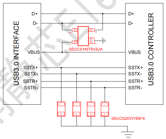 新增的两对差分线SSTX+/-和SSRX+/-共用一片六引脚回扫型ESD防护器件SEUCS2X3V1BB进行防护, SEUCS2X3V1BB是湖南静芯研发的一款超低电容ESD静电保护器件,专门设计用于保护高速数据接口免受过应力事件的影响,可适用于USB接口的高速差分信号线防护。