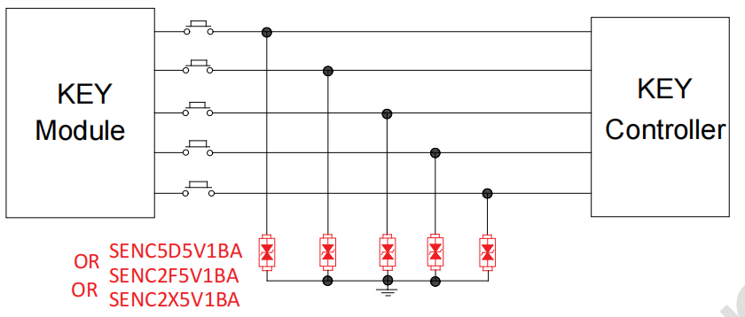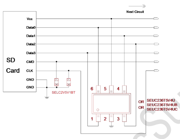 由于SD卡的数据线的传输速率较高,我们推荐选择低电容低钳位电压的集成六引脚ESD防护器件对SD卡的数据引脚与电源引脚进行防护,型号可选择SEUC236T5V4U 、SEUC236T5V4UB或SEUC236T5V4UC。三款型号都为低电容低钳位电压集成多路ESD静电二极管防护元件,可同时保护SD卡的五个引脚免受静电放电(ESD)和低等级浪涌事件的冲击与干扰。