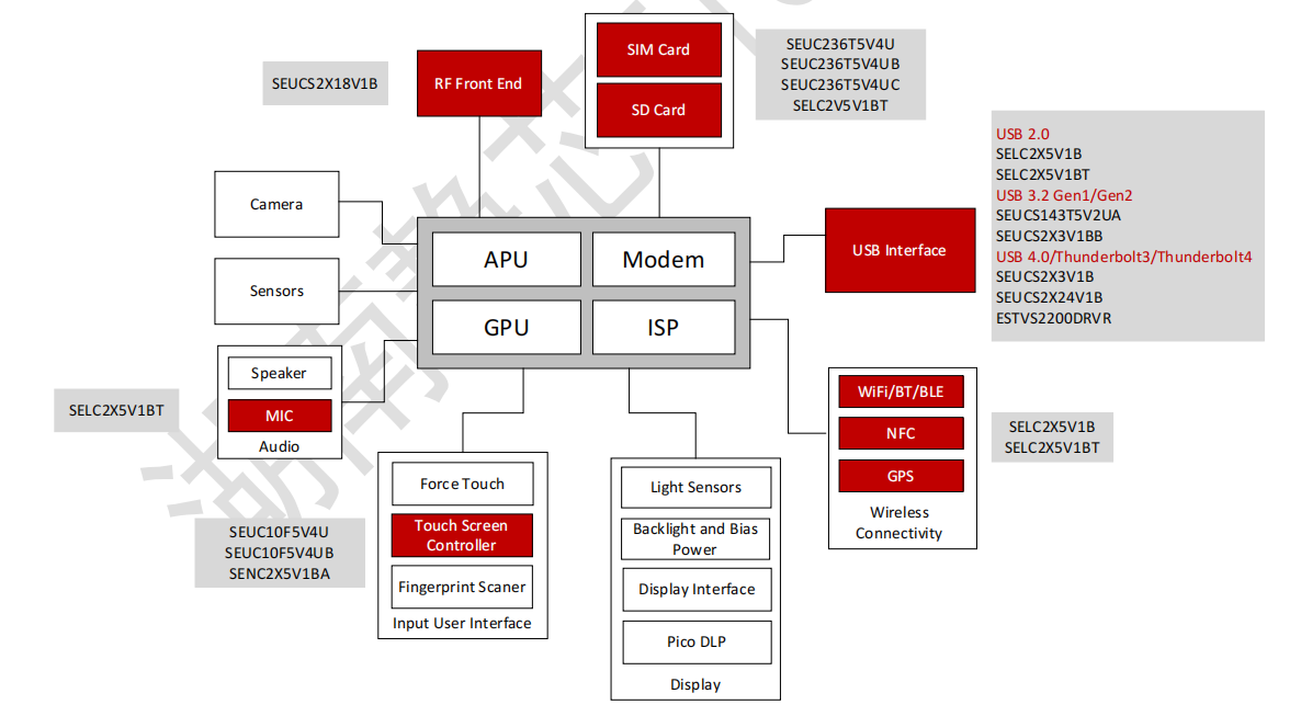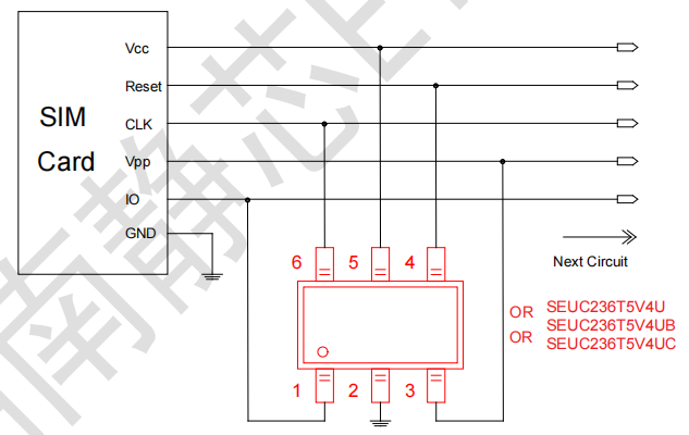针对SIM卡的静电防护方案,我们提供三款防护器件,可选择SEUC236T5V4U 、SEUC236T5V4UB或SEUC236T5V4UC作为ESD防护器件。三款器件都为集成多路ESD静电二极管防护元件,可同时保护SIM卡的五个引脚免受静电放电(ESD)和低等级浪涌事件的冲击与干扰。