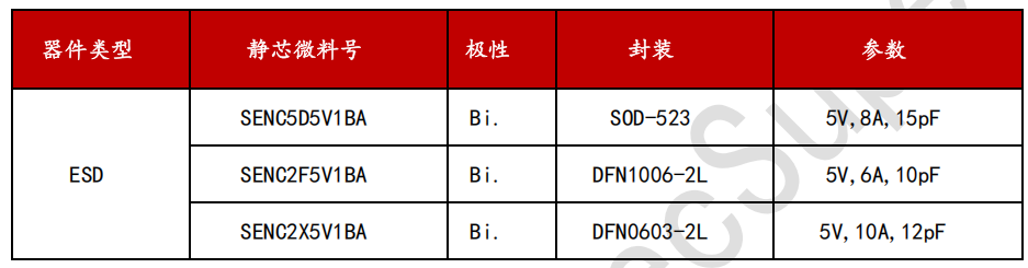 CC/SBU引脚我们推荐使用湖南静芯的双向ESD静电保护器件SEUCS2X24V1B,该器件采用超小型DFN0603-2L封装,工作电压为24V,钳位电压为5.6V,结电容仅为0.12pF, 符合IEC 61000-4-2 (ESD) 规范,在 ±15kV(空气)和 ±15kV(接触)下提供瞬变保护。