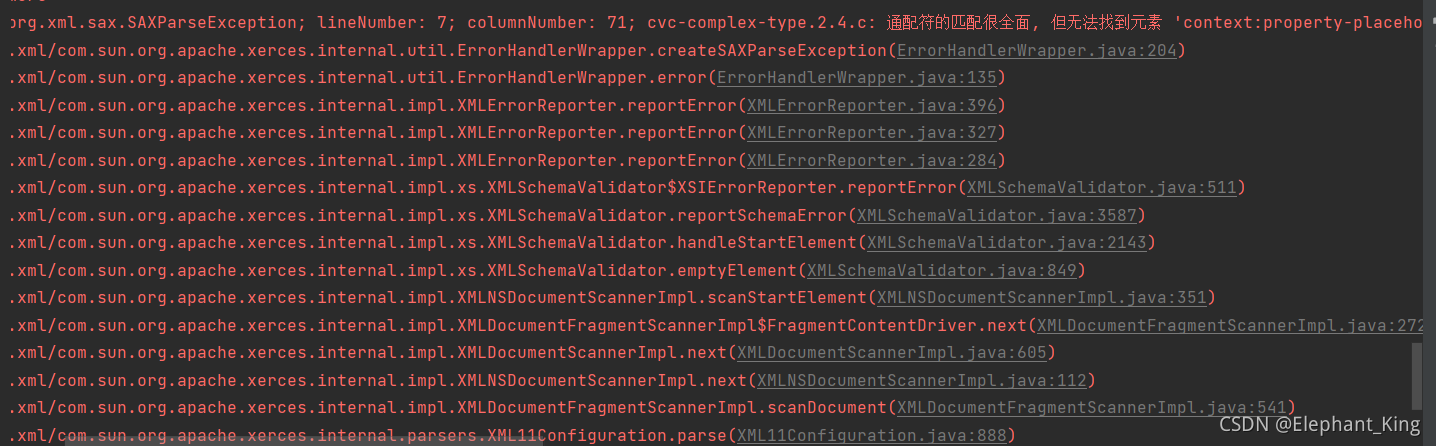 Caused by: org.xml.sax.SAXParseException; lineNumber: 7; columnNumber: 71; cvc-complex-type.2.4.c: 通配符的匹配很全面, 但无法找到元素 'context:property-placeholder' 的声明。
