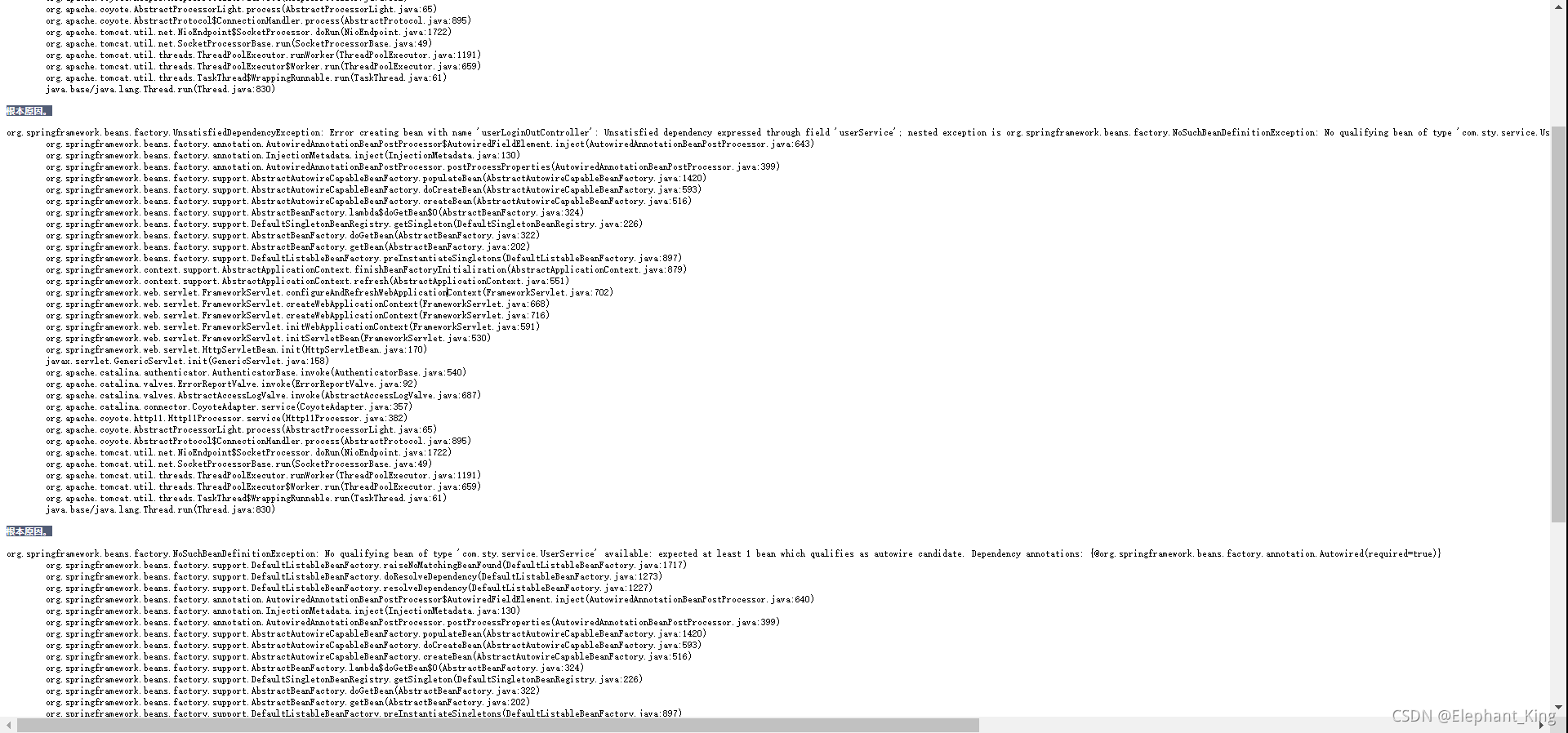 org.springframework.beans.factory.UnsatisfiedDependencyException: Error creating bean with name 'userLoginOutController': Unsatisfied dependency expressed through field 'userService'; nested exception is org.springframework.beans.factory.NoSuchBeanDefinitionException: No qualifying bean of type 'com.sty.service.UserService' available: expected at least 1 bean which qualifies as autowire candidate. Dependency annotations: {@org.springframework.beans.factory.annotation.Autowired(required=true)}