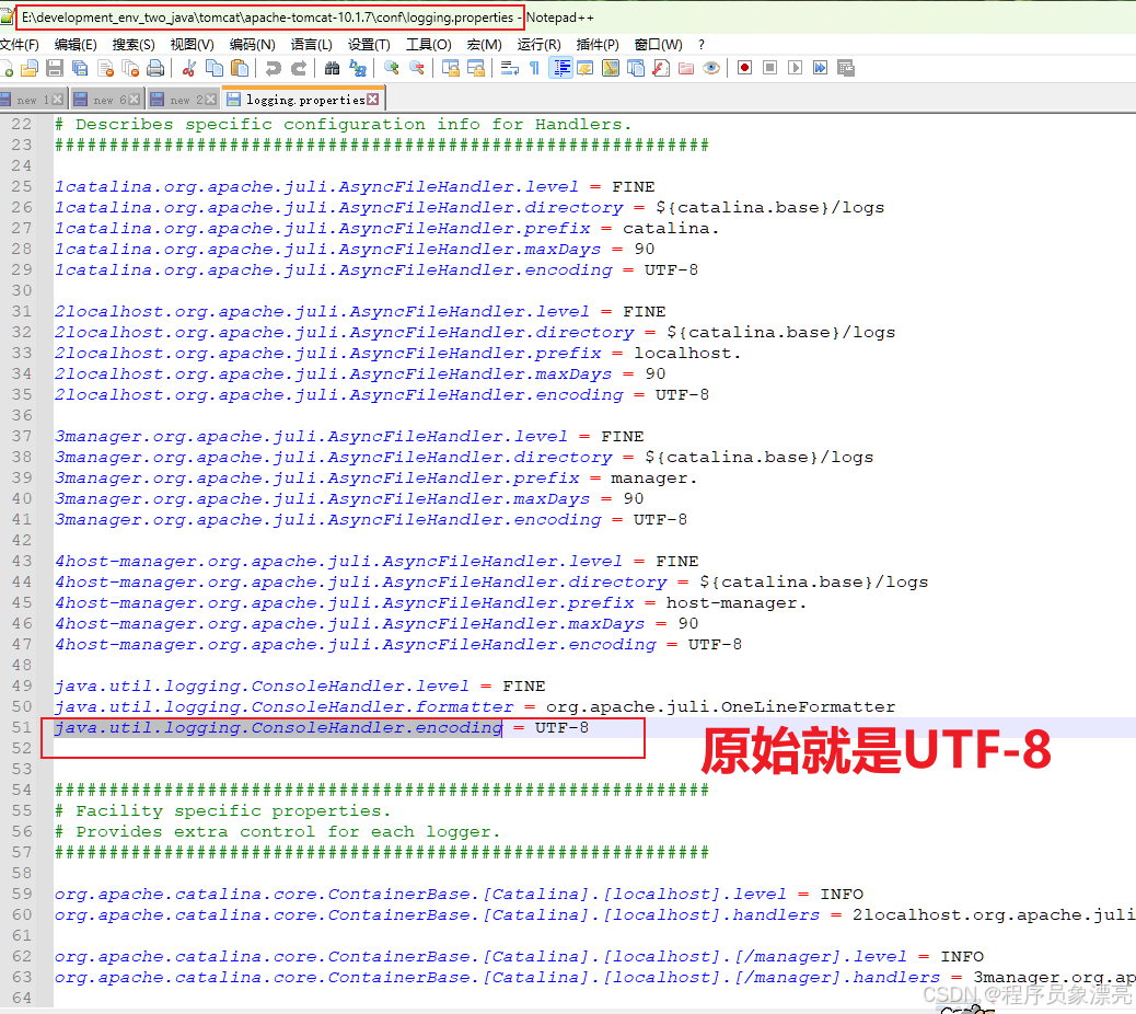 2-默认的apache-tomcat-10.1.7没有更改编码相关的配置文件(logging.properties),