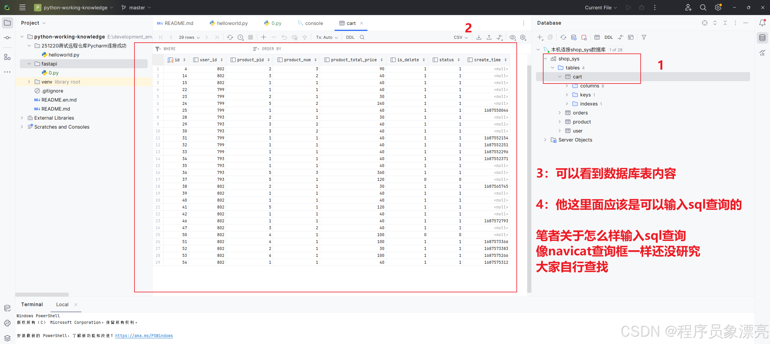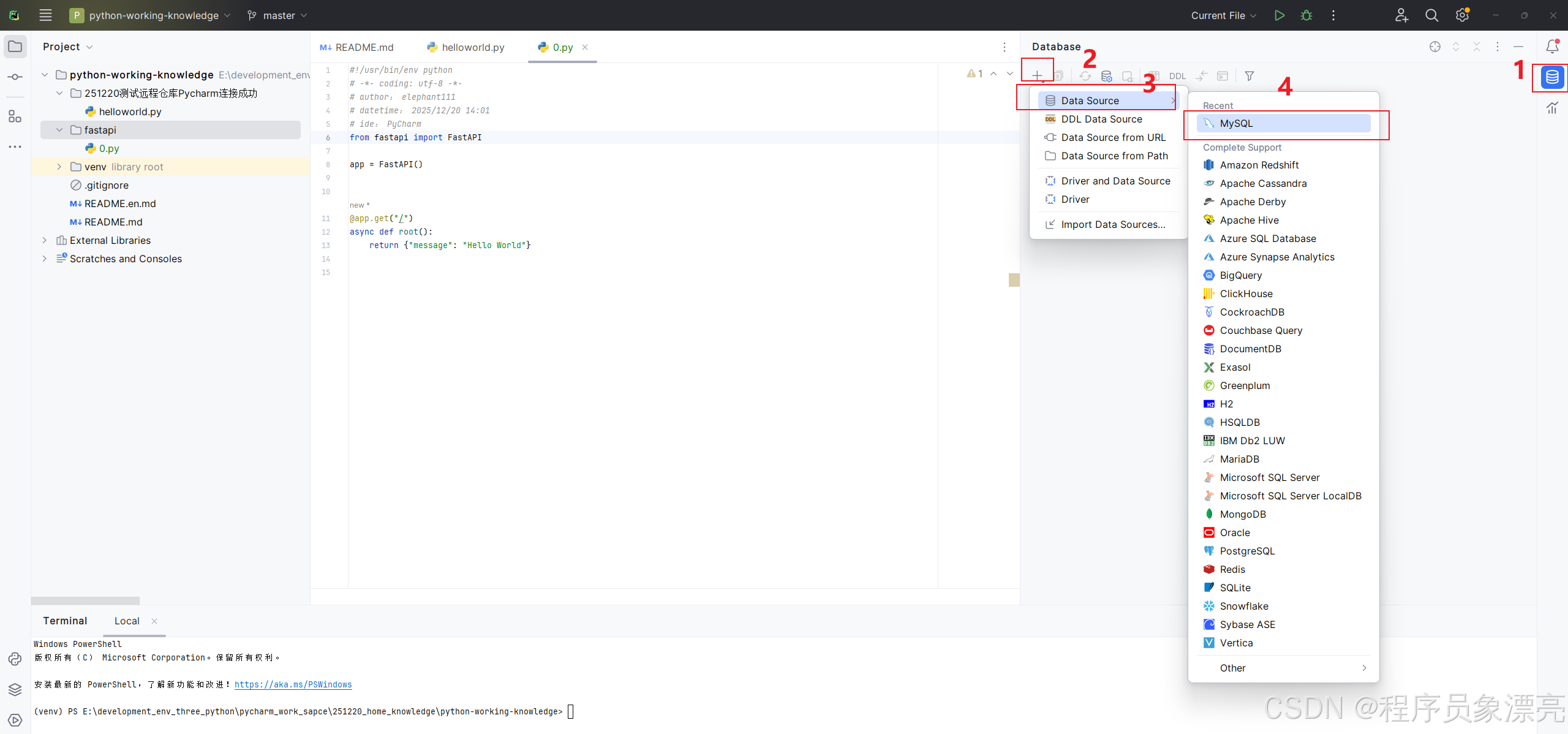 PyCharm中是可以自行连接MySQL数据库的,工作中一般使用Navicat居多,但有时候我们会遇到Navicat需要破解的情况,简单查看数据不需要导入的时候,我们可以使用PyCharm这个方案去连接MySQL数据库