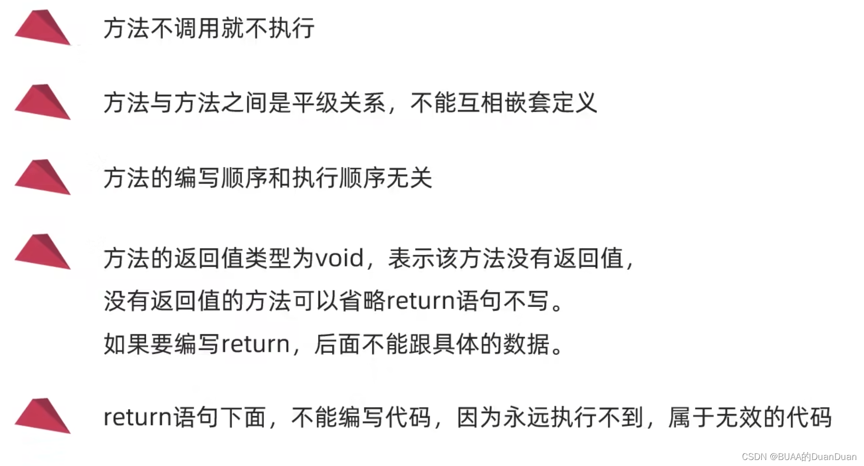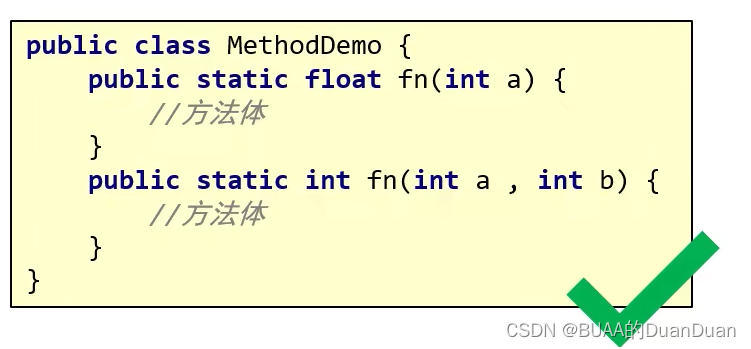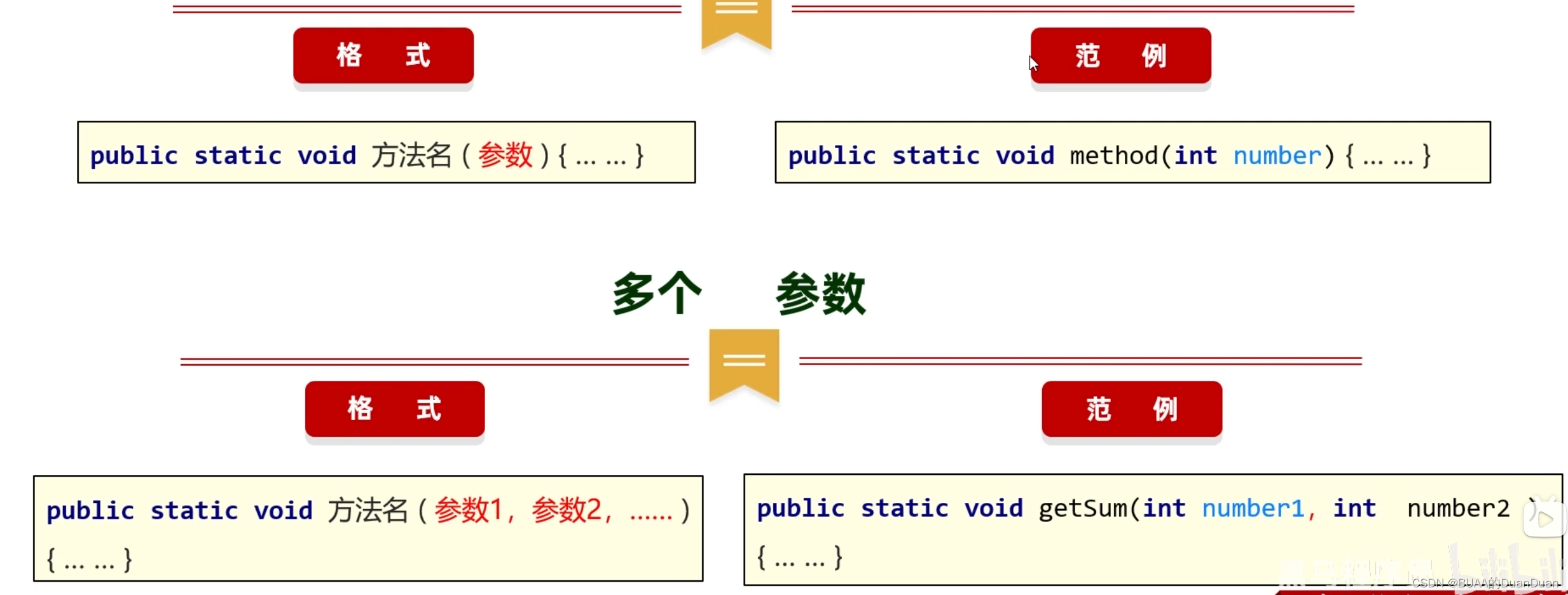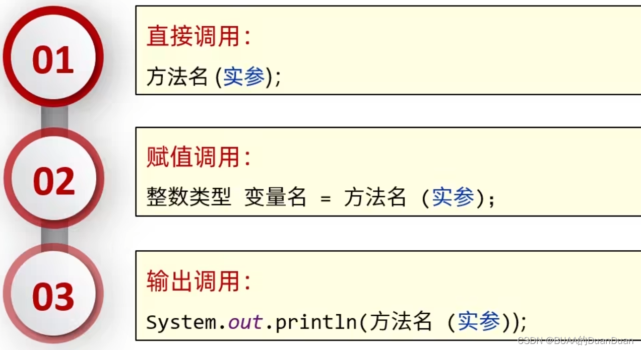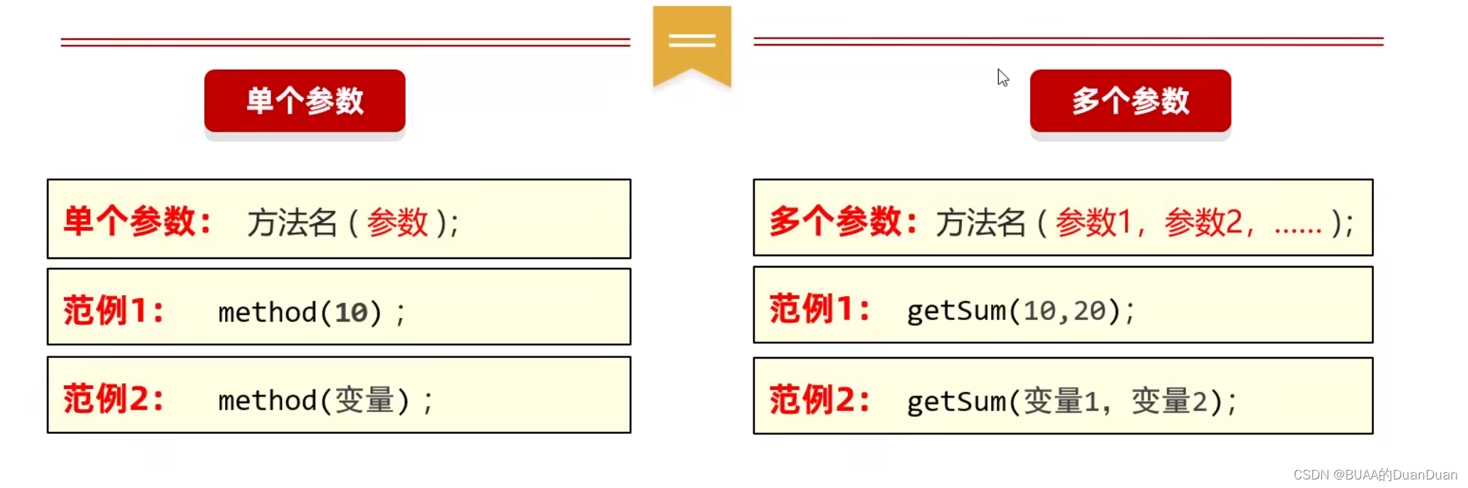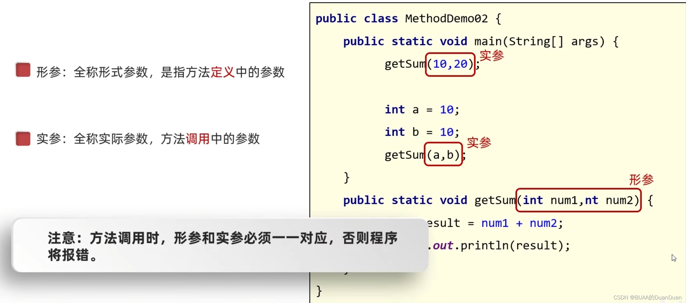 方法调用时,参数的数量与类型必须与方法定义中的设置相匹配,否则程序将报错