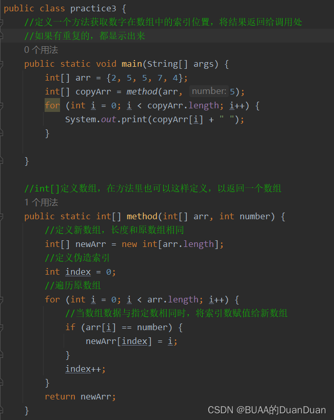 这里要知道5的索引位置,但是有两个位置都有5,所以注定return不止一个,这时候需要考虑利用return数组: