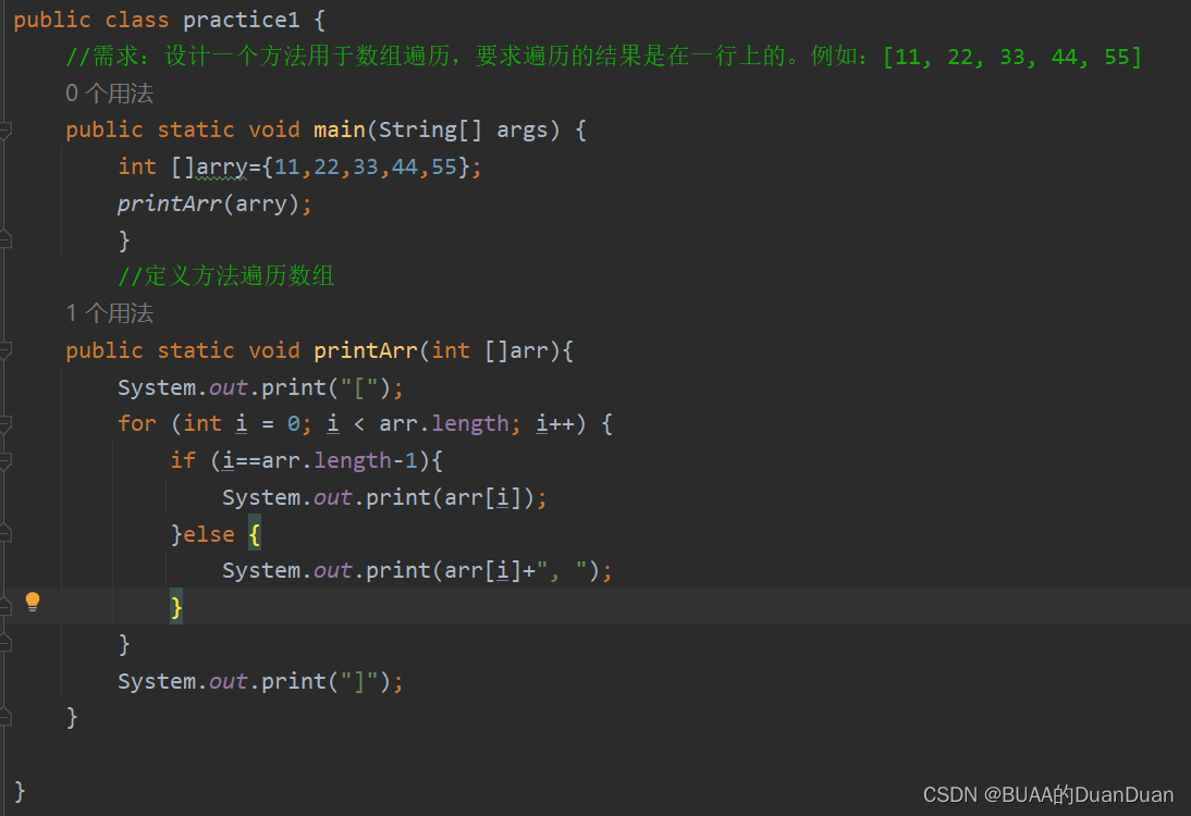 需求:设计一个方法用于数组遍历,要求遍历的结果是在一行上的。例如:[11, 22, 33, 44, 55]